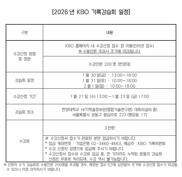 수강 신청은 21일 오후 1시부터 23일 오후 5시까지 KBO 홈페이지 수강신청 접수 창을 통해 가능하다. 기타 문의사항은 KBO 홈페이지 내 기록위원회 스코어링 필드 1:1 문의하기를 이용하면 된다.