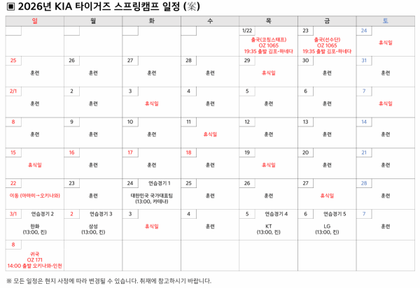 한편, KIA는 이번 스프링캠프를 1차와 2차로 나누어 진행한다. 먼저 선수단은 1월 25일부터 아마미오시마의 아마미 카와쇼 구장에서 체력 및 기술, 전술 훈련을 소화한다.