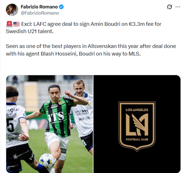 이적시장 소식에 정통한 파브리치오 로마노 기자는 20일(한국시간) 자신의 사회관계망서비스(SNS)를 통해 "LAFC가 스웨덴 U-21 대표팀 출신 유망주 부드리 영입에 합의했다. 이적료는 330만 유로(약 49억 원)"라고 단독보도했다.
