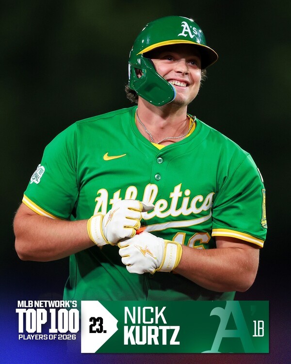 눈에 띄는 이름이 있다. 2025년 빅리그에 데뷔한 좌타 1루수 닉 커츠(애슬레틱스)다. 기존 로만 앤서니(보스턴 레드삭스)의 41위를 넘어 2025년 데뷔 선수 최고 순위를 경신하는 데 성공했다.