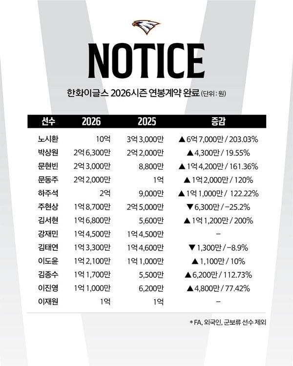 대상자 중 팀내 최고 연봉자는 노시환으로, 지난해 3억 3,000만 원에서 6억 7,000만 원 인상된 10억 원에 계약했다. 이는 팀 내 최고 인상률(약 203%)이자 최대 인상액이다.