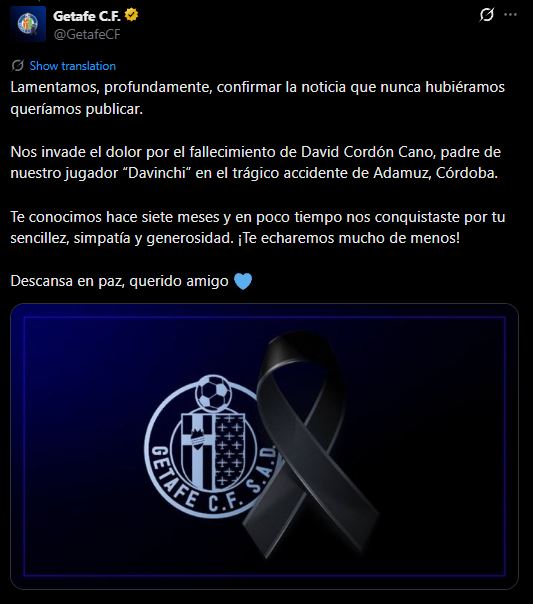 구단은 “우리는 결코 발표하고 싶지 않았던 이 소식을 전하게 돼 참담한 심정이다. 코르도바주 아다무스에서 발생한 비극적인 사고로, 우리 선수 다빈치의 아버지 다비드 코르돈 카노가 세상을 떠났음을 확인한다”고 전했다.