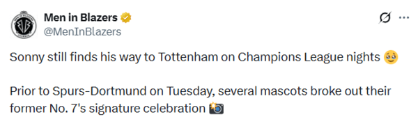 '맨 인 블레이저스'는 이를 두고 "쏘니는 여전히 UCL 경기가 있는 밤이면 토트넘으로 돌아온다"며 손흥민을 향한 그리움을 전했다.
