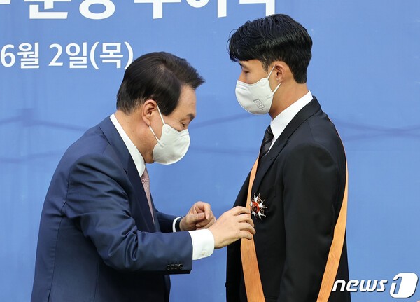 당시 대통령실은 “손흥민 선수가 국가대표로서 월드컵 최다 골을 기록했고, 2018년 아시안게임 금메달 획득 등 대한민국 축구 발전에 크게 기여했다”고 수훈 배경을 설명했다.