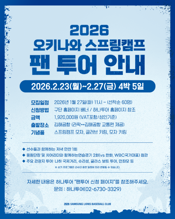 [SPORTALKOREA] 김지현 기자= 삼성 라이온즈가 오는 27일 오전 11시부터 2026년 오키나와 스프링캠프 팬투어 참가자를 모집한다.