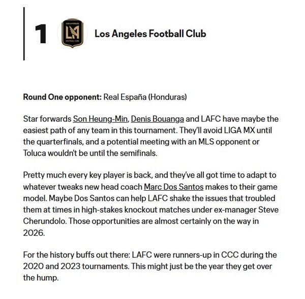 MLS 사무국은“손흥민과 데니스 부앙가를 앞세운 LAFC는 이번 대회에서 가장 편한 대진을 받은 팀일지도 모른다. 8강까지 멕시코 LIGA MX 팀을 피할 가능성이 크며, 준결승에서야 톨루카 혹은 MLS 구단을 만날 수 있다”고 분석했다.