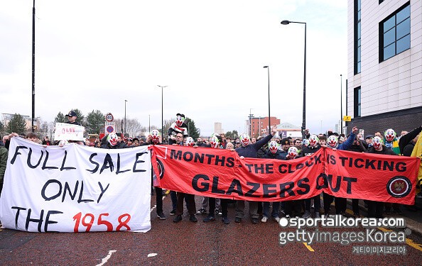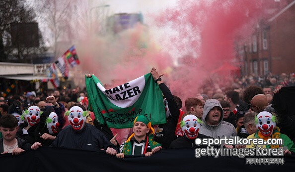 매체에 따르면 맨유 서포터즈 그룹 '더 1958'은 풀럼과의 홈경기를 앞두고 올드 트래퍼드 외부에서 대규모 시위를 진행했다. 시위대 선두에는 광대 가면을 쓴 팬들이 자리했는데, 이는 앞서 성명을 통해 구단주 짐 래트클리프 경을 '무능한 광대'라고 비판한 데 따른 퍼포먼스였다.