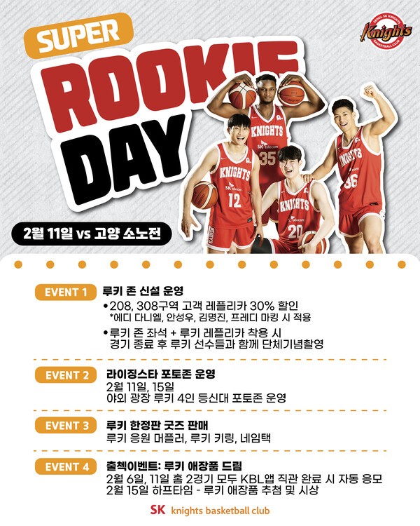 [SPORTALKOREA] 이정엽 기자= 서울 SK나이츠는 오는 11일 오후 7시에 열리는 고양 소노와의 홈 경기 를 '루키 데이'로 정하고 팬 감사 이벤트를 운영한다고 4일 밝혔다.