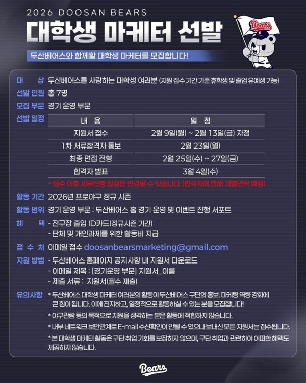 [SPORTALKOREA] 한휘 기자= 두산 베어스는 2026시즌 경기 운영 부문 대학생 마케터를 선발한다고 9일 공지했다.