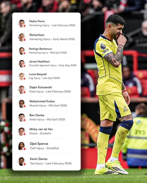 토트넘은 올 시즌 내내 심각한 부상 악재에 시달리고 있다. 수비진에서는 데스티니 우도기, 케빈 단소, 벤 데이비스, 페드로 포로가 이탈했고, 중원에서도 로드리고 벤탄쿠르, 루카스 베리발, 데얀 쿨루셉스키, 제임스 매디슨이 전력에서 빠졌다. 공격진 역시 모하메드 쿠두스, 히샬리송, 윌슨 오도베르가 부상으로 전열에서 이탈한 상태다.