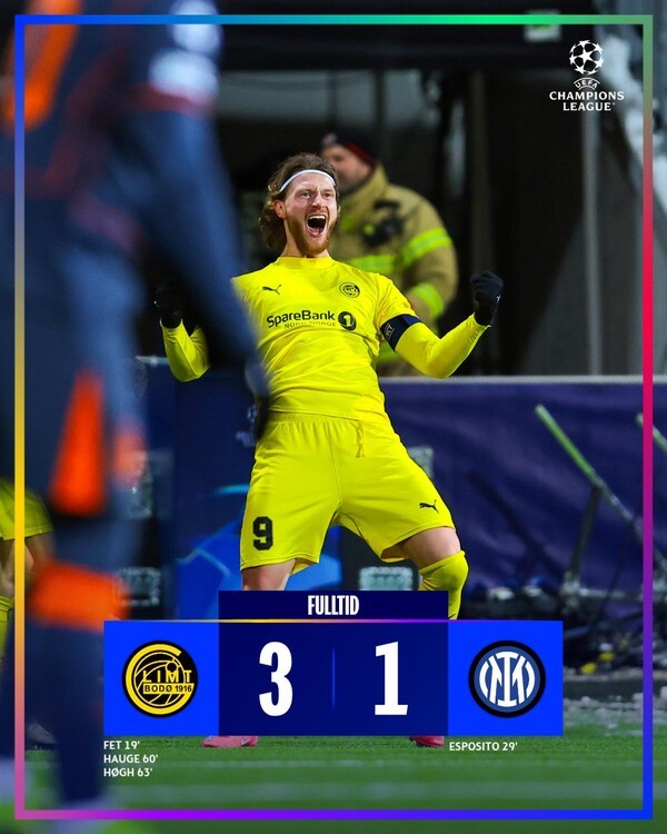 보되/글림트는 19일(이하 한국시간) 노르웨이 보되의 아스미라 스타디움에서 열린 2025/26시즌 UEFA 챔피언스리그(UCL) 녹아웃 플레이오프 1차전에서 인터밀란을 3-1로 꺾었다.