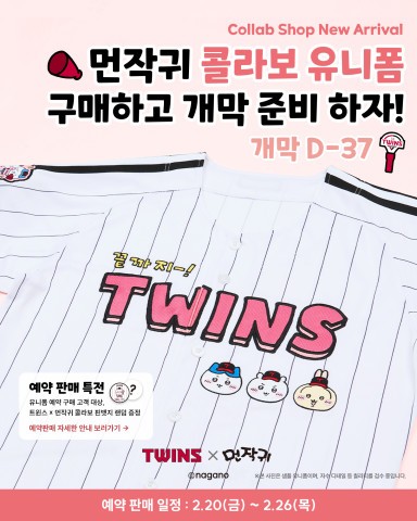 먼작귀 콜라보 유니폼 예약 판매는 2026년 2월 20일(금) 15시부터 2월 26일(목) 15시까지 진행되며 판매처는 LG트윈스 공식 온라인몰 ‘콜랩샵(https://www.twinscorestore.co.kr)’이다.