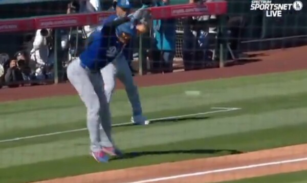 1회 첫 타석에서 내야 안타를 날린 오타니는 이어진 후속 타자들의 안타와 볼넷으로 3루까지 진루했다. 아찔한 장면은 그 직후 벌어졌다. 2사 만루에서 타석에 들어선 김혜성이 볼카운트 1-2에서 상대 투수의 직구를 받아쳤다. 그런데 타구가 3루에 있던 오타니를 향해 날아갔다. 오타니는 순간적으로 허리를 뒤로 빼며 가까스로 피했지만, 이내 중심을 잃고 그대로 앞으로 엎어졌다.