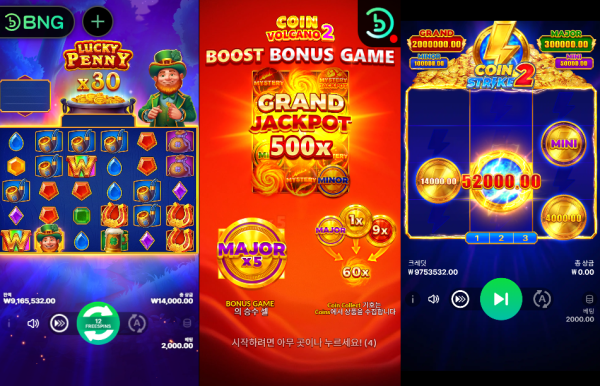 럭키페니, 코인볼케이노, 코인스트라이크... 부운고 인기 게임 삼대장 한 번에 돌리는 중. 보너스 게임 진입하는 타이밍 겹치면 정신없는데 그게 또 개꿀잼임