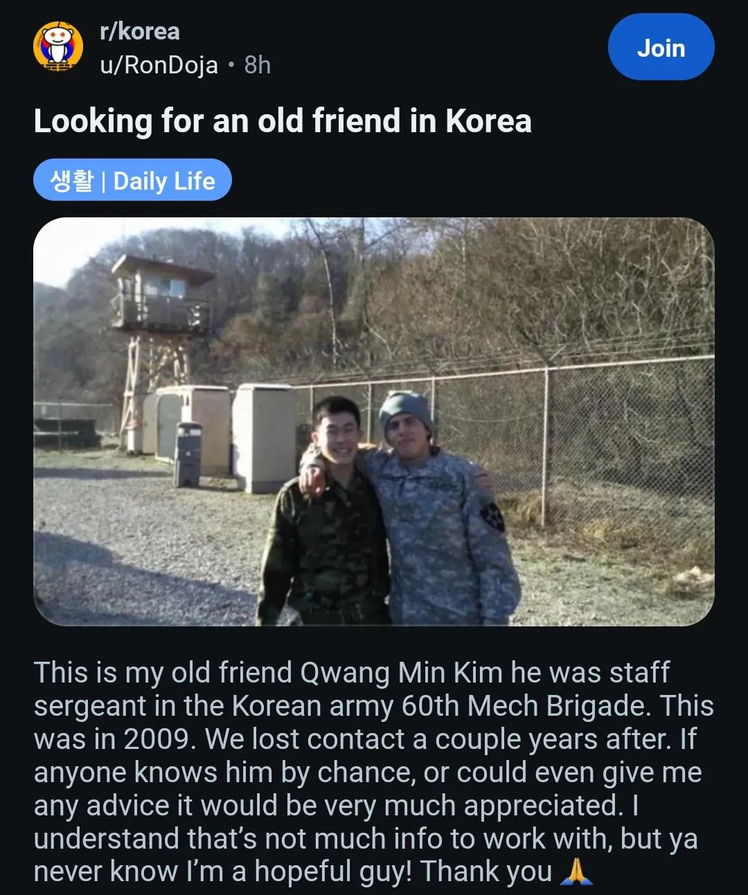 “이 사람은 제 오랜 친구 김광민입니다. 그는 한국군 제60기계화보병여단에서 하사로 복무했었습니다. 이 사진은 2009년에 찍은 것이고, 우리는 그로부터 몇 년 후에 연락이 끊겼습니다. 혹시라도 그를 아는 분이 있거나, 조금이라도 도움이나 조언을 주실 수 있다면 정말 감사하겠습니다. 정보가 많지 않다는 건 알고 있지만, 그래도 혹시 모르니까요. 저는 희망을 가져보는 사람입니다! 감사합니다 ?”