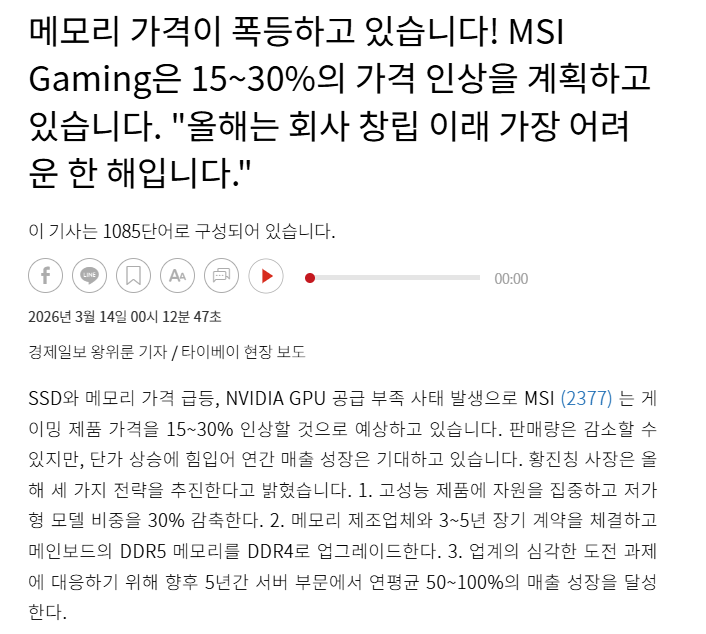 MSI 그래픽카드 가격 15~30% 인상 예정