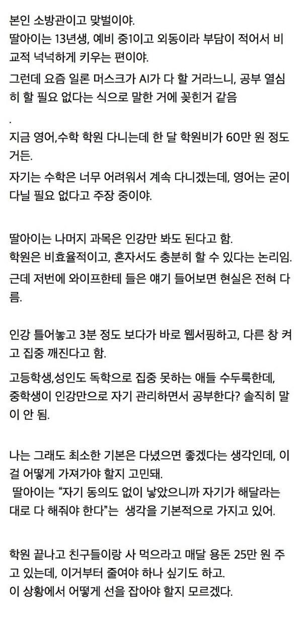 열람중 학원 안 다니겠다는 딸아이의 논리 등급아이콘 레벨아이콘 커뮤관리자 01.25 129