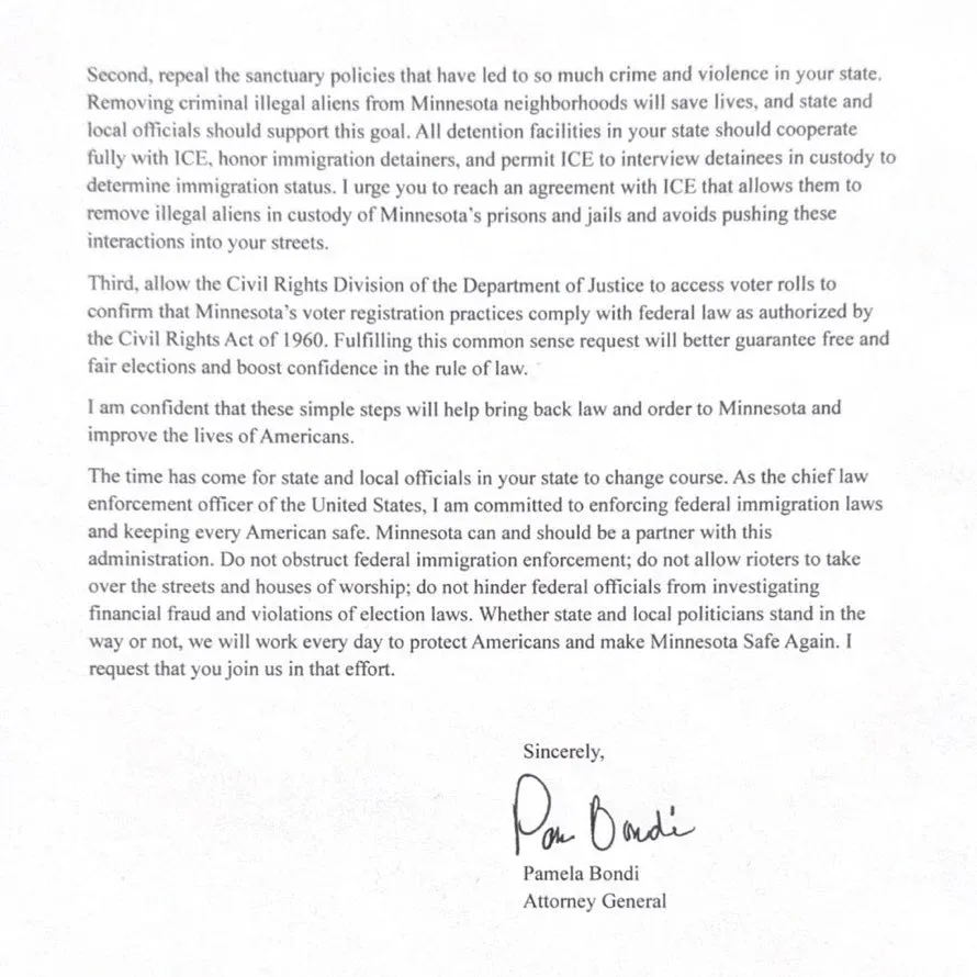 팸 본디는 오늘 미네소타 주 정부 관계자들에게 서한을 보내, 미네소타가 트럼프 행정부에 유권자 명부를 넘길 경우 ICE가 해당 주에서 철수하겠다는 입장을 밝혔다.