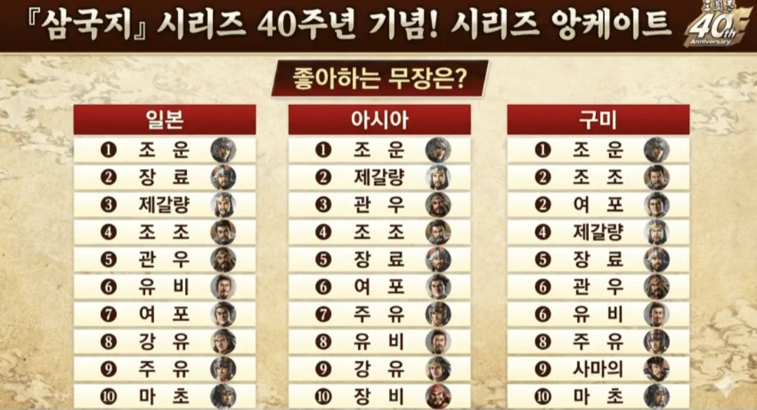 코에이 삼국지 무장, 전세계 인기 투표 결과