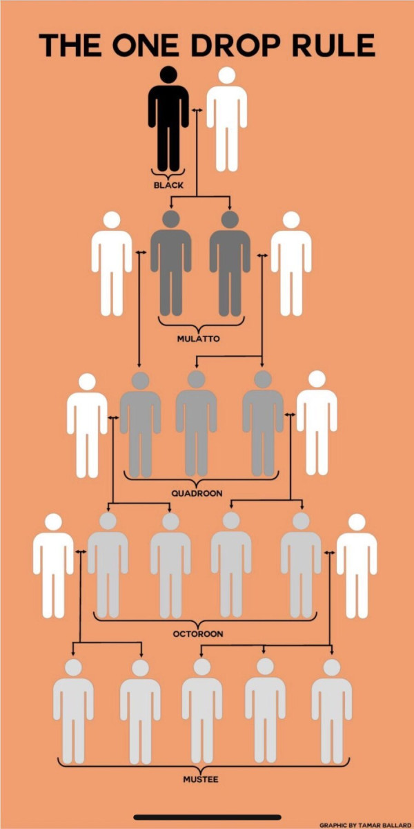 당시 미국에 존재하던 원 드랍 룰 때문에 흑인 피가 단 한 방울이라도 섞였으면 흑인으로 분류됨