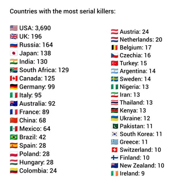 국가별 역대 연쇄살인범 집계 순위