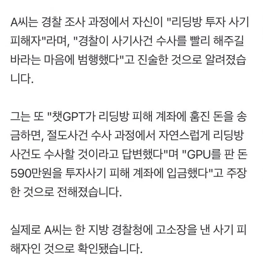 2. 수사가 느려 지피티에게 물어보니 훔친 돈을 송금하면 절도건을 수사하며 같이 수사해 줄 것이라 알려줌