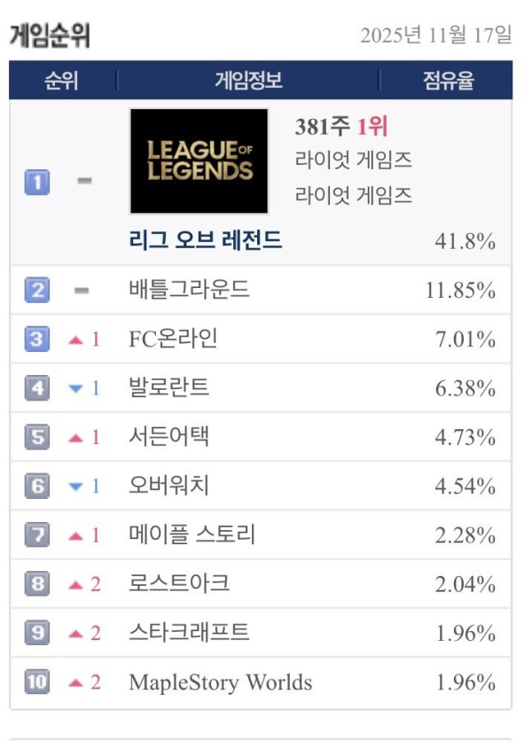 열람중 최신자 PC방 게임 점유율 순위 등급아이콘 레벨아이콘 커뮤관리자 2025.11.18 162