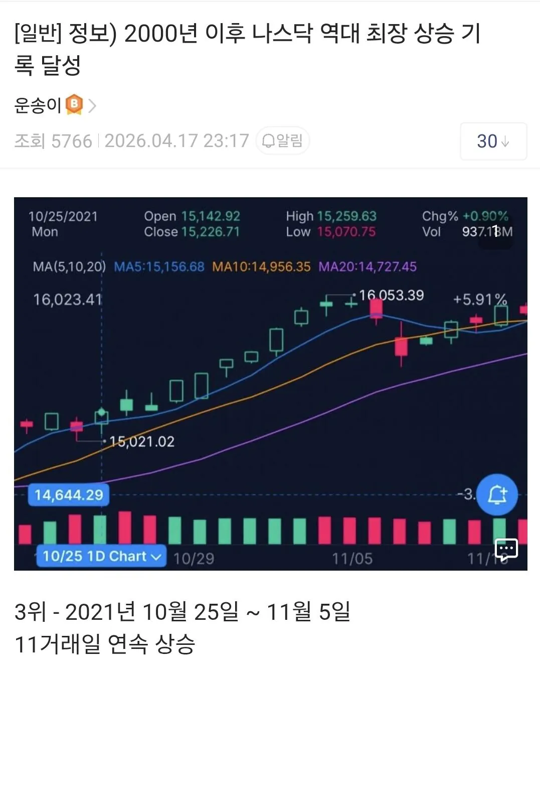2000년 이후 나스닥 역대 최장상승 기록 달성