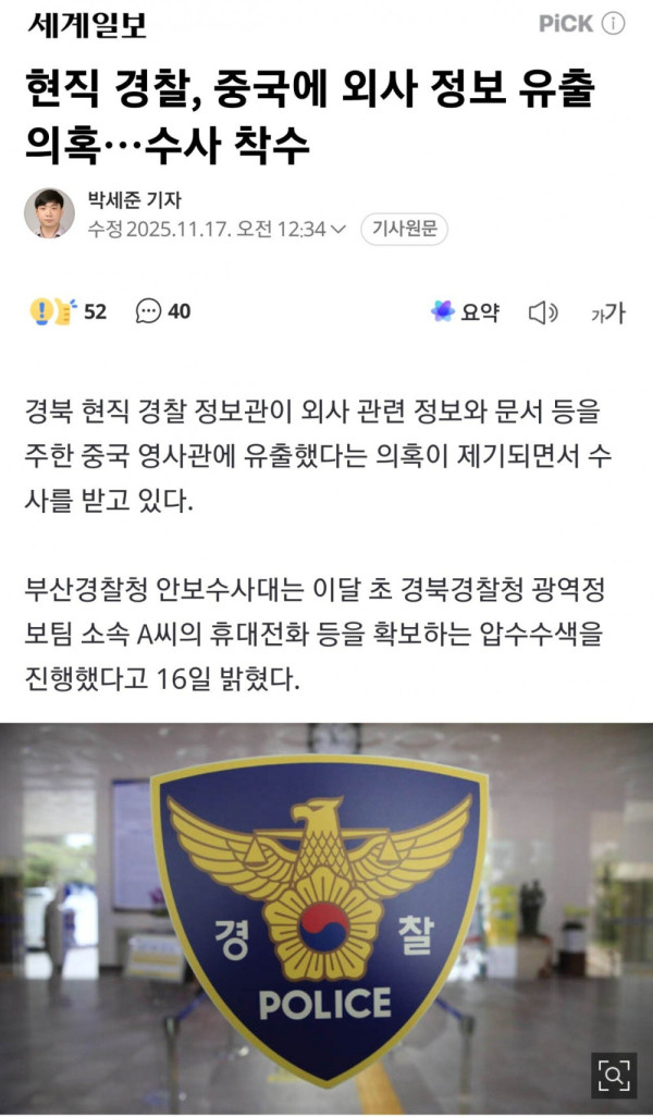 현직 경찰, 중국에 외사 정보 유출 의혹