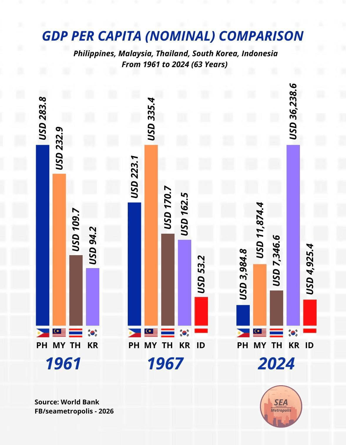 1961년, 필리핀은 동남아시아 국가들 중 가장 높은 1인당 GDP를 기록했던 반면, 한국은 최빈국 중 하나였습니다.