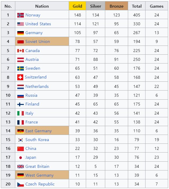 당연히 미국이 하계올림픽처럼 동계올림픽도 역대 1위일줄 알았는데 아니였음...