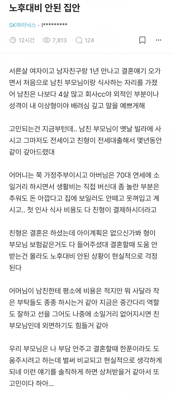 남친 부모님 노후 대비 안되어서 결혼 망설이는 하이닉스녀