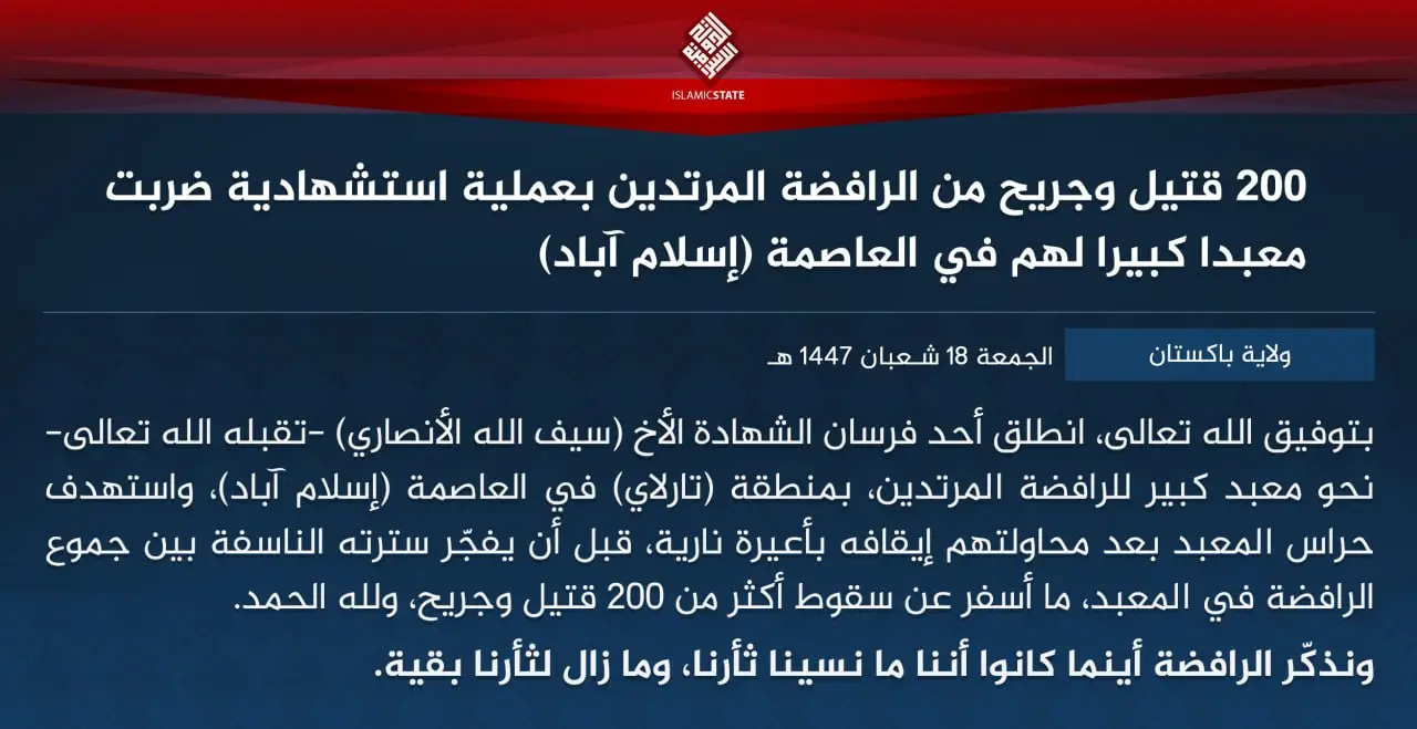 "전능하신 알라의 도움으로, 순교의 기사 가운데 한 명인 형제 (사이풀라 알안사리)가 수도 이슬라마바드의 타를라이(Tarlai) 지역의 배교자 시아파의 대형 사원을 향해 출발하였다.