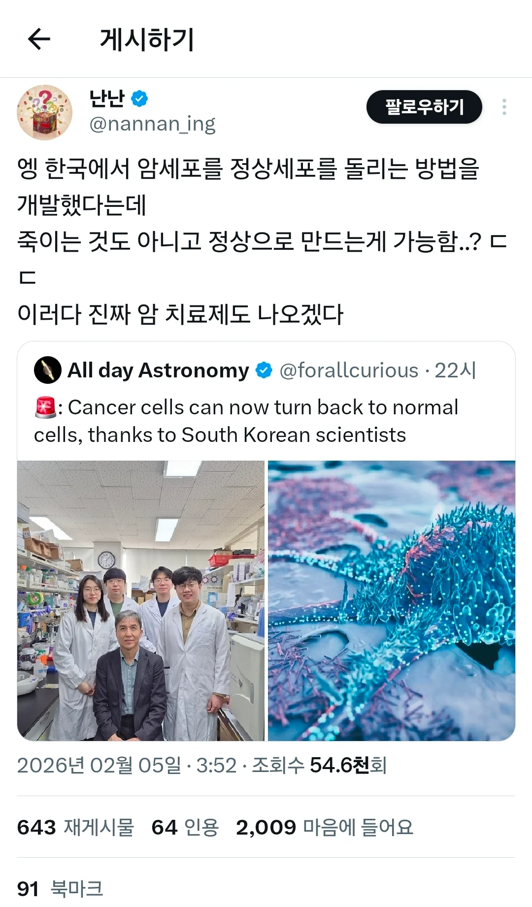 암세포를 정상세포로 컴백시키는 기술 개발