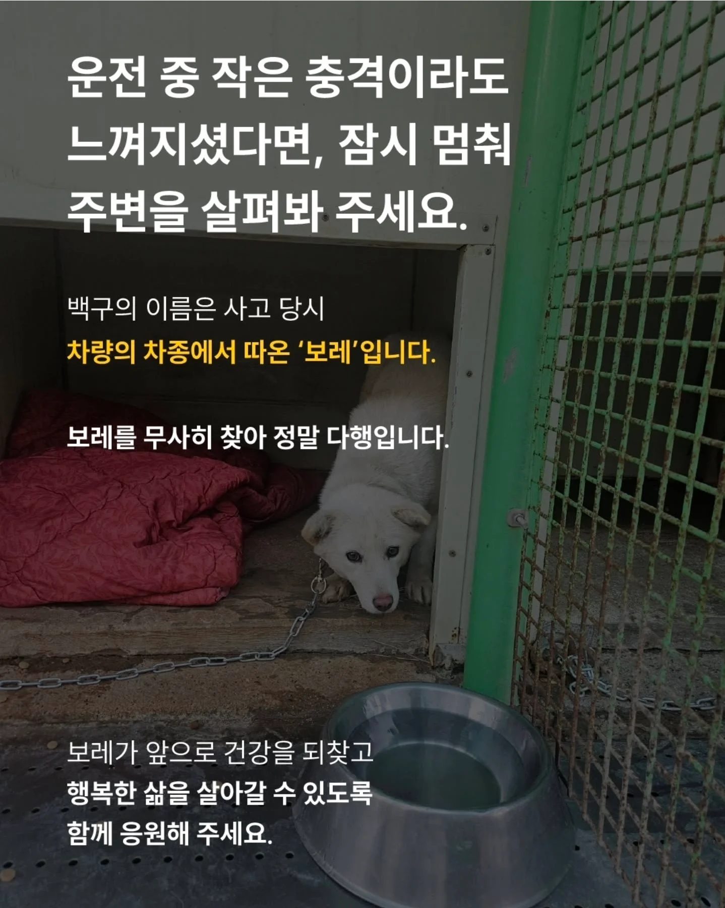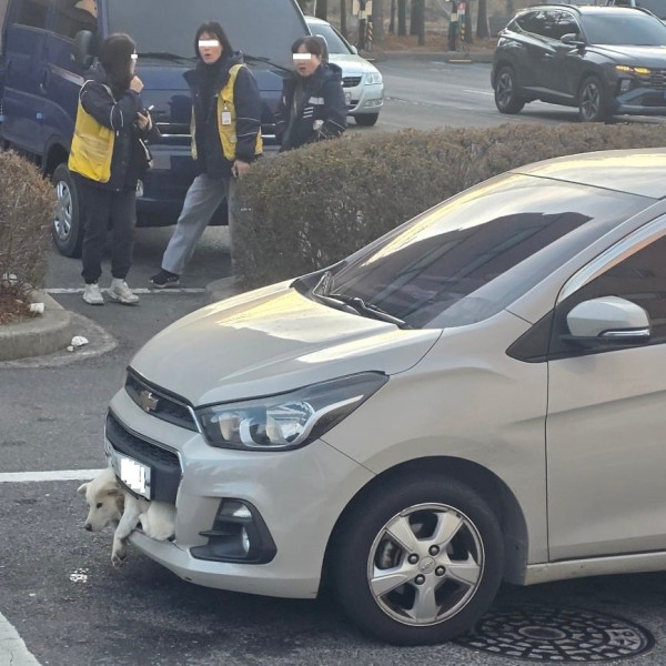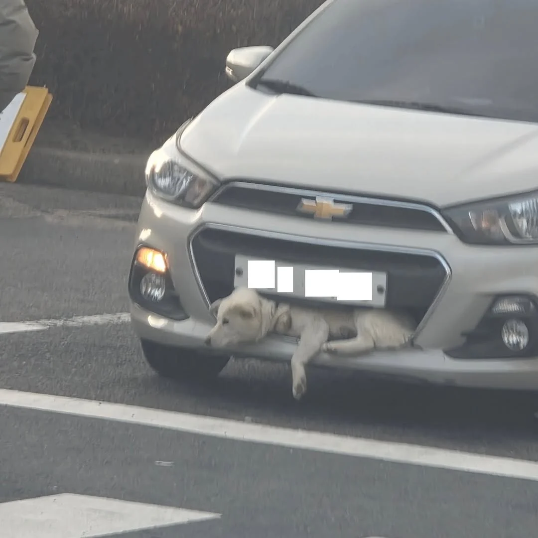 쉐보레 스파크 범퍼에 낀 채로 발견된 백구