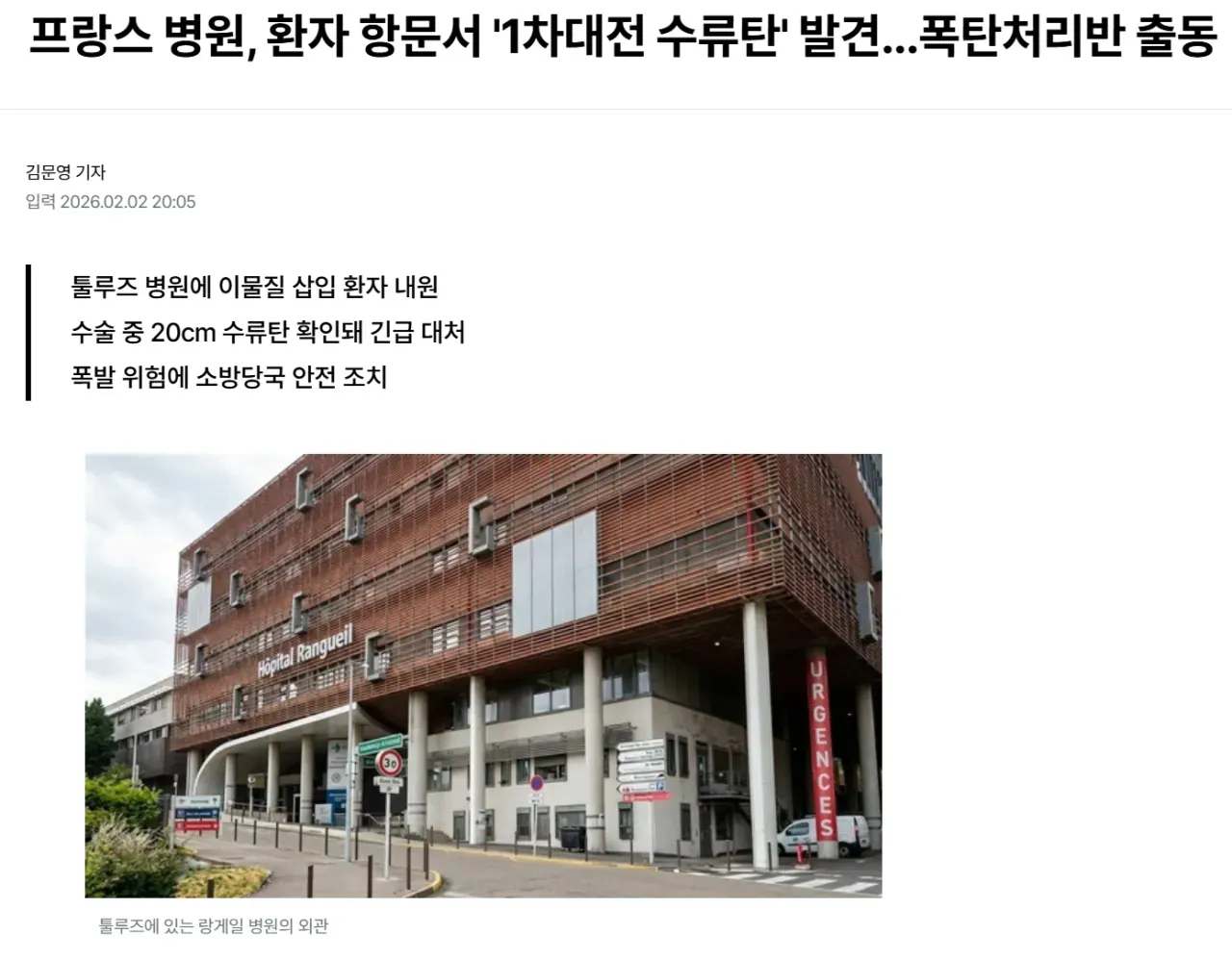 프랑스 언론 라데페슈 뒤 미디에 따르면 현지시간 2월 1일 프랑스 툴루즈 남동부의 한 병원에서 환자 항문에서 1차 세계대전 수류탄이 발견되는 이례적인 사건이 발생하여 폭탄 처리반이 출동하는 소동이 벌어졌다. 환자의 위험한 행동으로 인해 병원 의료진과 직원들은 한때 긴장 상태에 놓였으며, 폭발 가능성에 대비한 긴급 조치가 시행되었다.