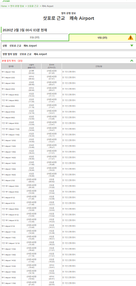 공항 <> 삿포로역 열차 지연 및 운행 중지