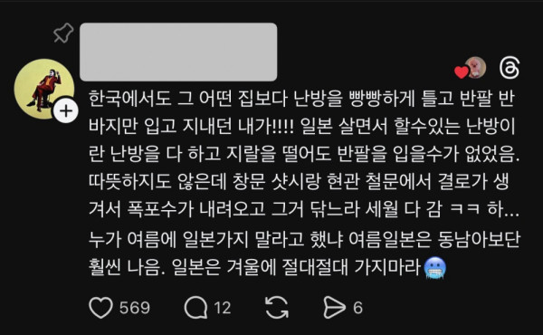 추운 일본집에 단단히 한이 맺힌 듯함