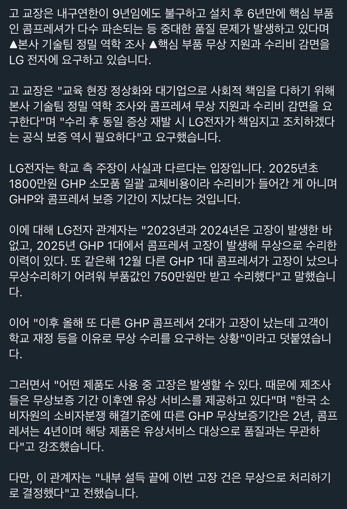 보증 기간 이미 지났고 관리 소홀 문제도 있으나, 학교 현장의 어려움을 고려해 최근 발생한 고장 건은 무상 처리하기로 결정함.