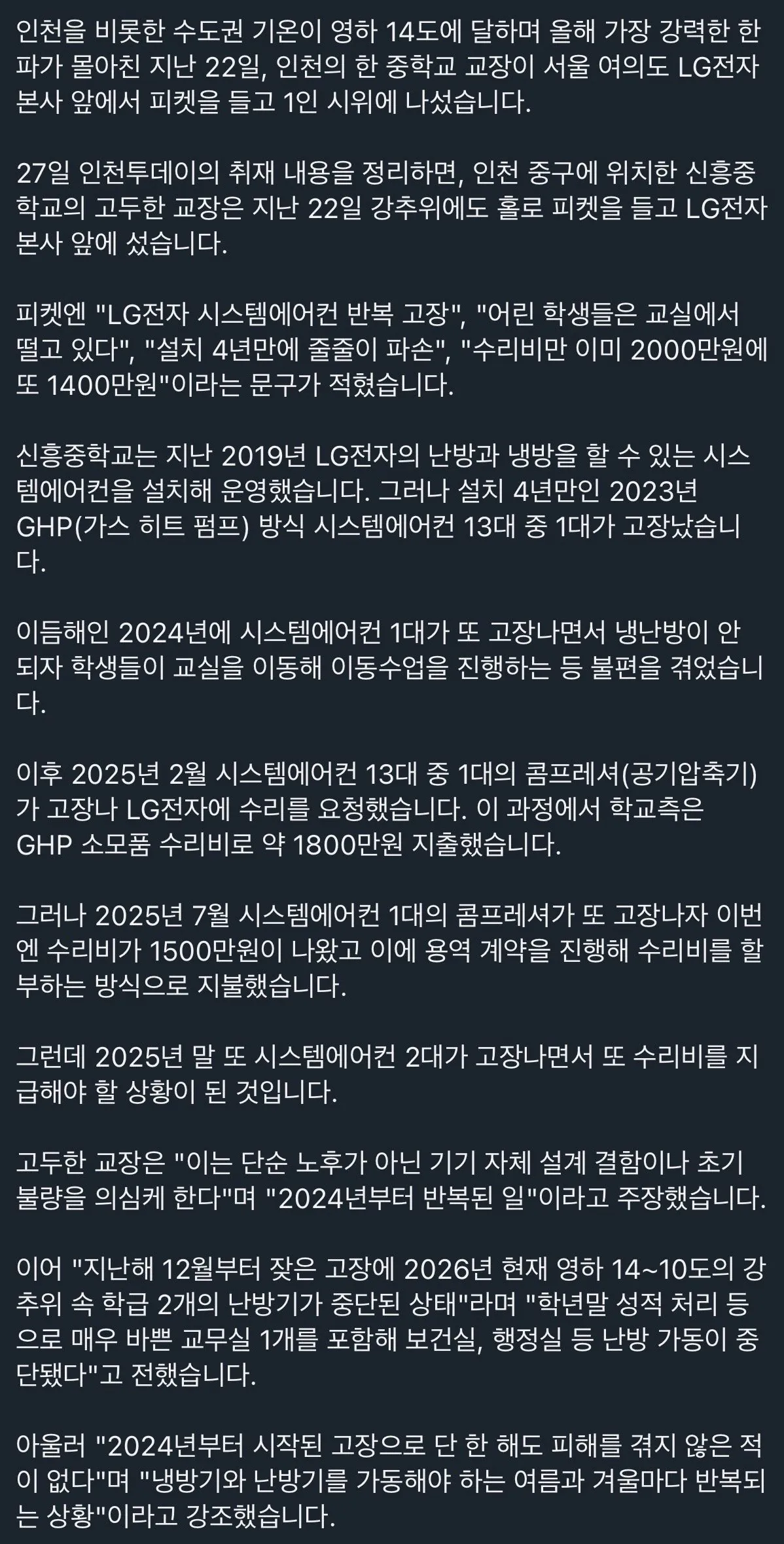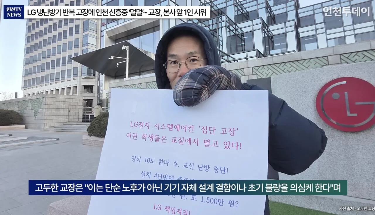 인천 신흥중학교 교장이 LG전자 본사 앞에서 잦은 시스템 에어컨(GHP) 고장과 과도한 수리비 문제로 1인 시위 진행