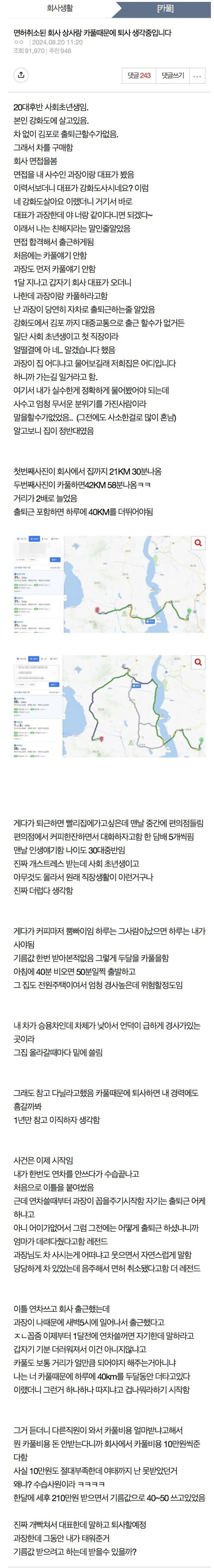 면허 취소된 상사랑 카풀 때문에 퇴사 고민인 사람