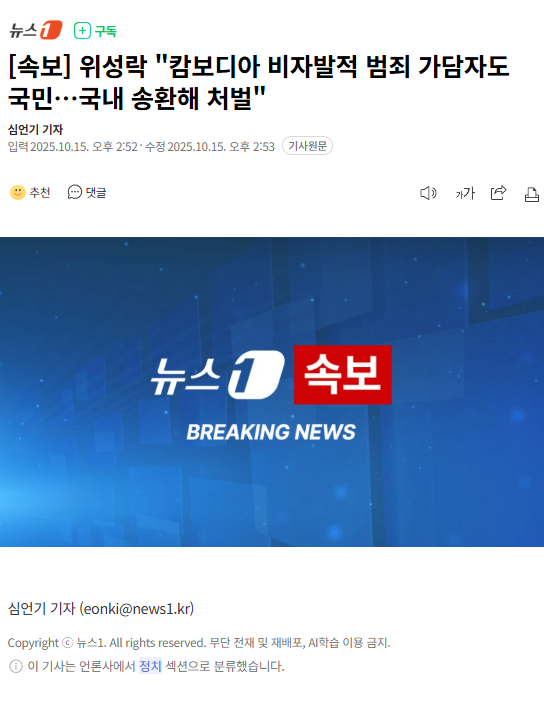 [속보] 위성락 "캄보디아 비자발적 범죄 가담자도 국민…국내 송환해 처벌" - 뉴스1