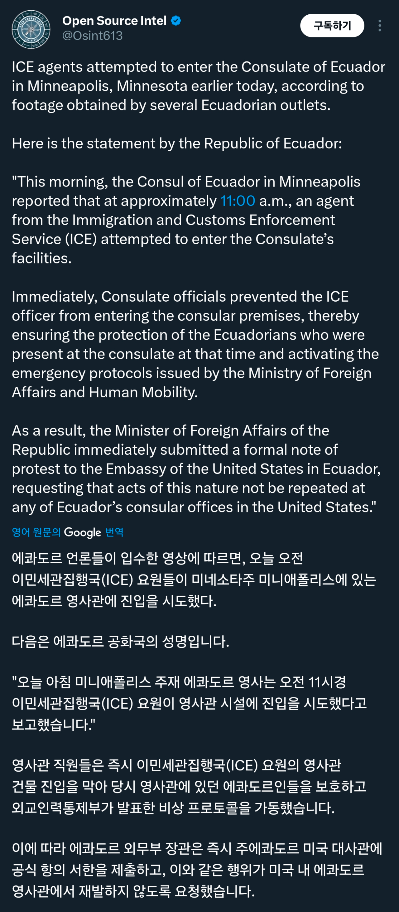 [속보] 미국 ICE, 에콰도르 영사관 강제 진입 시도