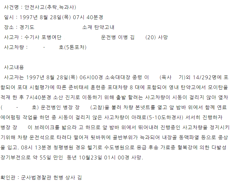 일시 : 1997년 8월 28일(목) 오전 07시 40분경장소 : 경기도 가평 수기사 포병여단사망자 : 운전병 이병 김00(20세)