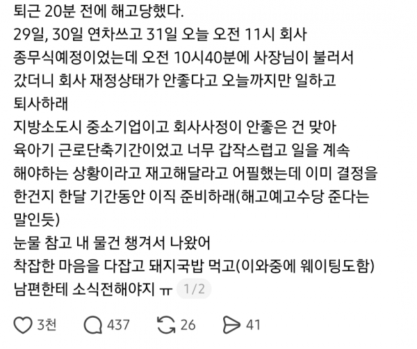 퇴근 20분 전 해고 당한 애엄마 사연