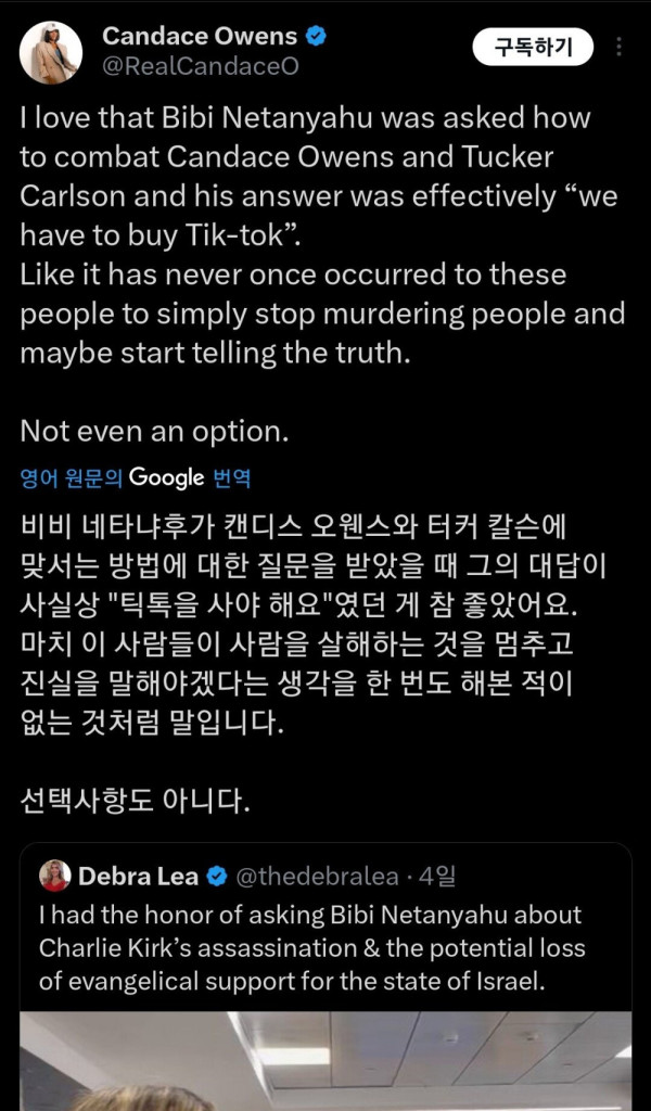 [ 찰리커크 암살은 네타냐후와 이스라엘이 배후에 있을것이다 라고 주장하는 캔디스 오웬스 반응 : 네타냐후 발언 봐라 ]