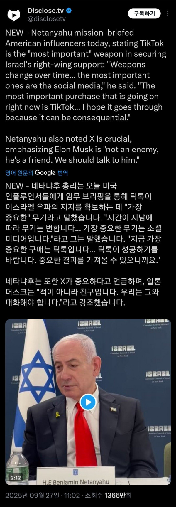 [ 네타냐후 : 현재 무기는 소셜 미디어, 틱톡 인수는 호재 ]