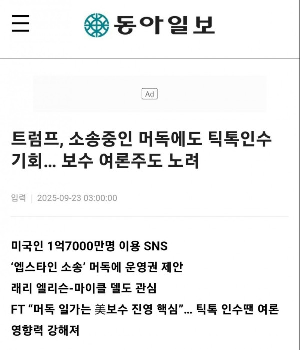트럼프, 소송중인 머독에도 틱톡인수 기회… 보수 여론주도 노려|동아일보