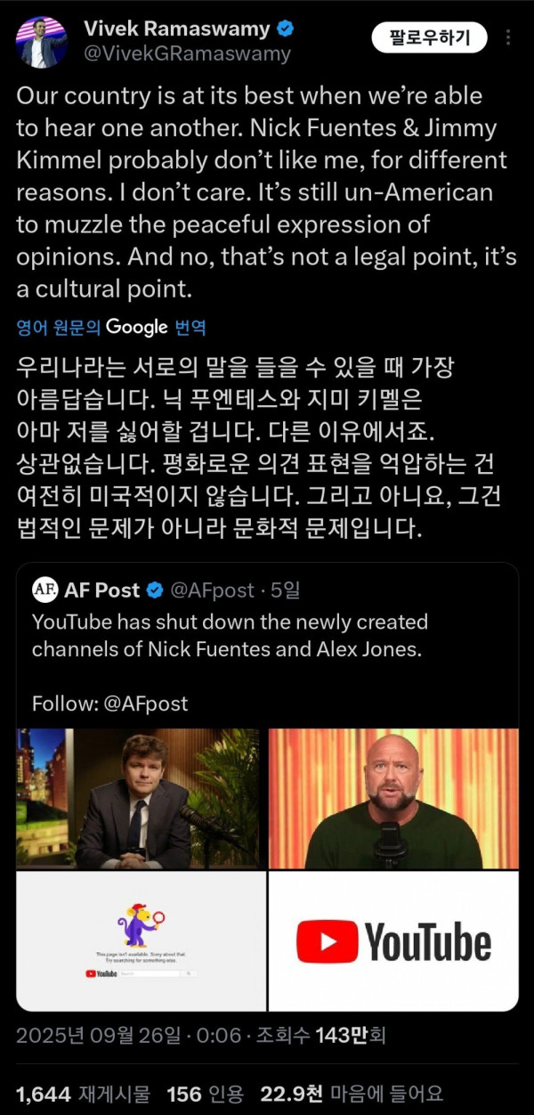 [ 한때 DOGE 공동 설립자이자 현재 오하이오 주지사 출마 예정인 비벡 라마스와미 : 얘네는 왜 유튜버 계정 복구 안해줘 ? ]