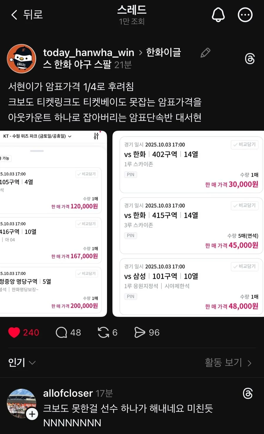 열람중 KBO 한화 이글스 암표 가격 근황 등급아이콘 레벨아이콘 커뮤관리자 14:55 39